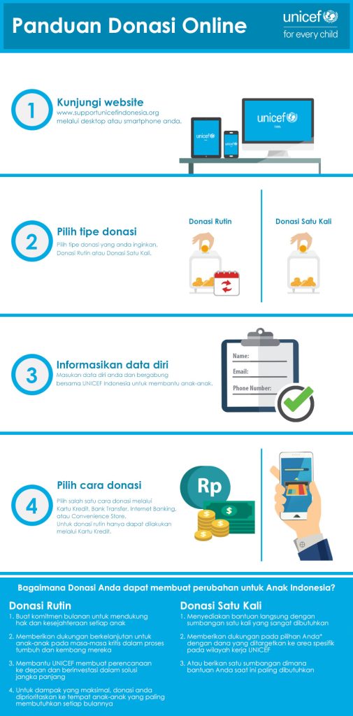 Pemberian donasi secara online melalui UNICEF Indonesia bisa Anda lakukan melalui situs resmi donasi UNICEF Indonesia di laman https://www.supportunicefindonesia.org/. Untuk menjadi pendekar anak, Anda bisa memilih jenis donasi Pendekar anak dan melakukan donasi setiap bulannya secara otomatis.