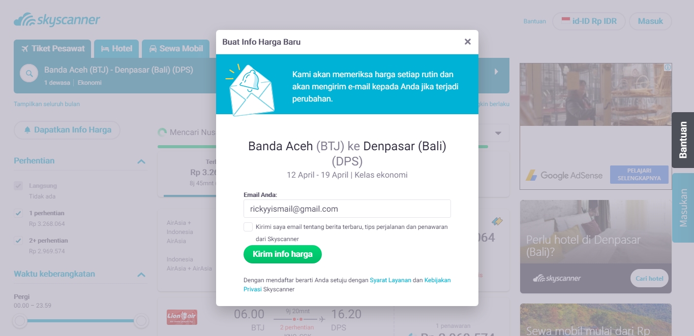 Fitur yang saya suka dari Skyscanner yaitu adanya fitur Info Harga Baru yang akan mengirimkan update harga terbaru pada tanggal yang kita pilih, nantinya informasi itu akan dikirimkan ke email kamu.